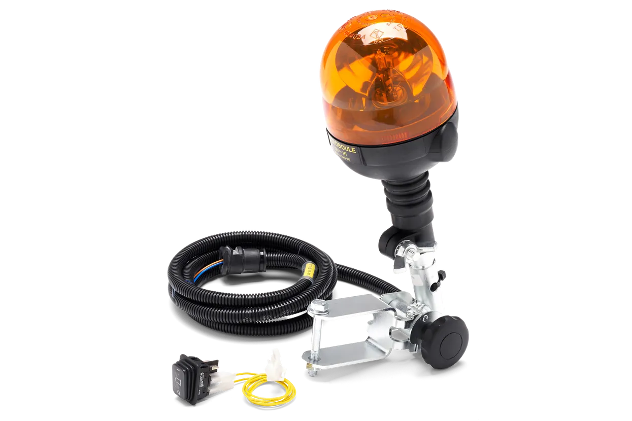 Orange rotating flashing light. To be installed to the ROPS bar. Post, wires and switch included. Suits P525D, P525DX