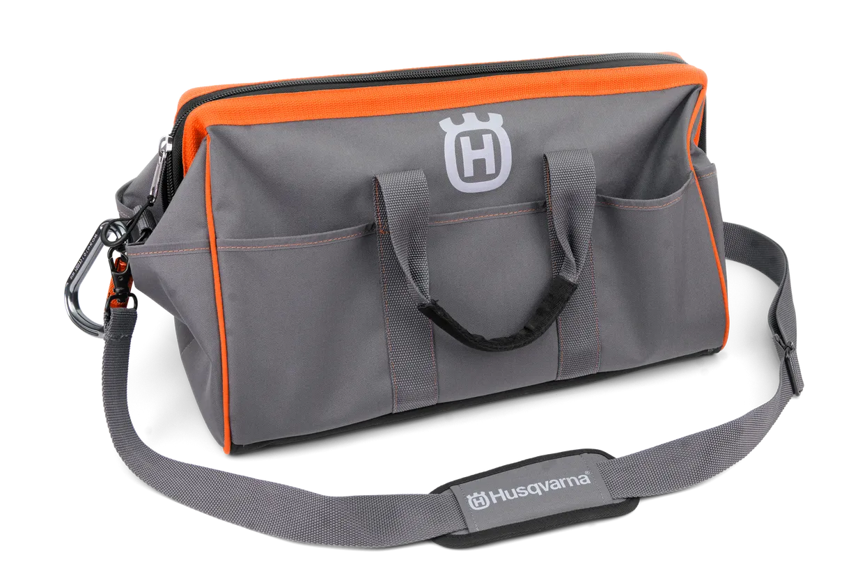 Top-quality Husqvarna tool bag that’s versatile enough for a variety of gear and accessories. Arborists, forestry pros, landscapers and even homeowners can hold and organize numerous tools with this heavy-duty bag that’s 600D coated and water resistant. The bag includes helpful features like a large-toothed zipper for easy access, a padded shoulder strap and comfortable handles, conveniently placed pockets, and both interior and exterior webbing reinforcement. Features high-visibility silk screened branding so you can show your Husqvarna pride wherever your work takes you.