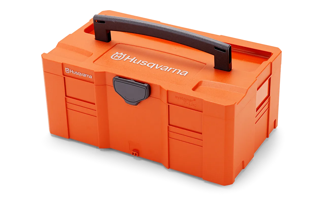 Box for safe transport and storage of Husqvarna backpack batteries, batteries, chargers and other accessories. The box is compatible with the Systainer-Box-System.