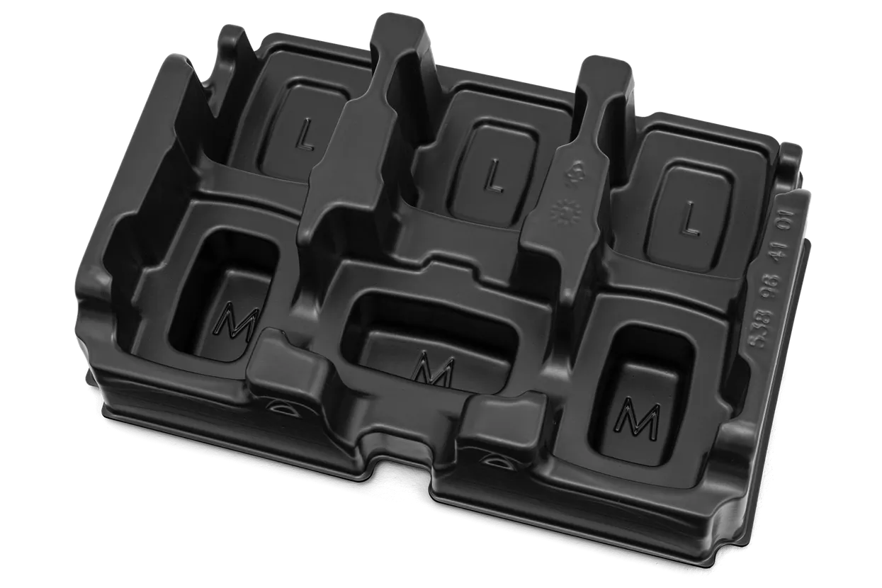Robust insert for Husqvarna battery box, tailored for up to 3pcs of 36V M size* batteries and 3pcs of 36V L size** batteries.