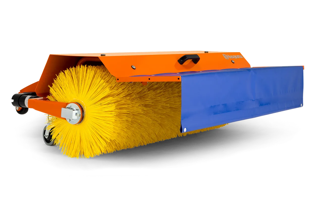 Powerful rotating broom for sweeping leaves, gravel, snow, etc. Easily angled in both directions from the control panel at the driver’s seat. Two rear solid support wheels follows the contour of the ground.