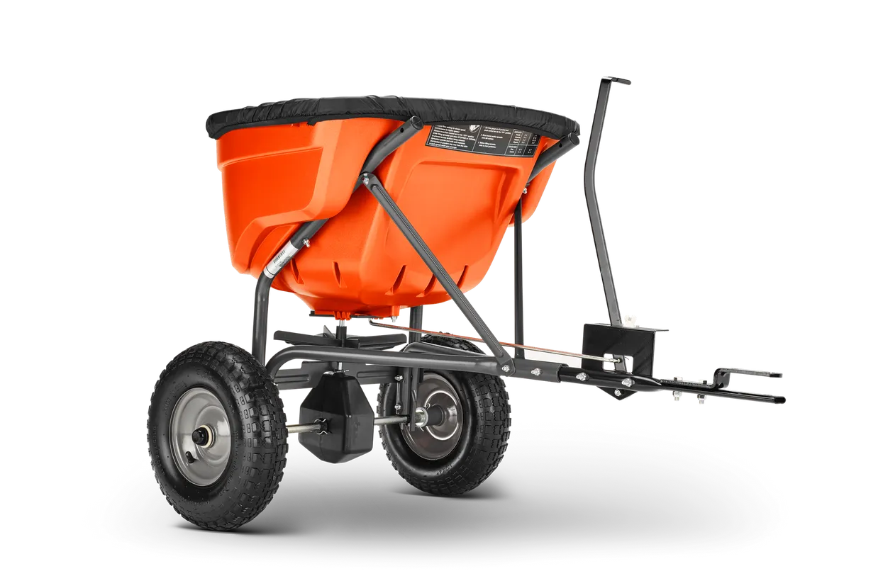 Handy spreader with easily adjustable flow, for larger areas. Enclosed commercial-grade gearbox for smooth rolling and easy maintenance. Large pneumatic tyres for easy manoeuvrability. Durable nylon cover included. Can be used for spreading fertilizer and seeds in your garden, as well as ice melt during winter season. If used with salt, make sure to clean spreader hopper and tubes after use, to prevent corrosion.