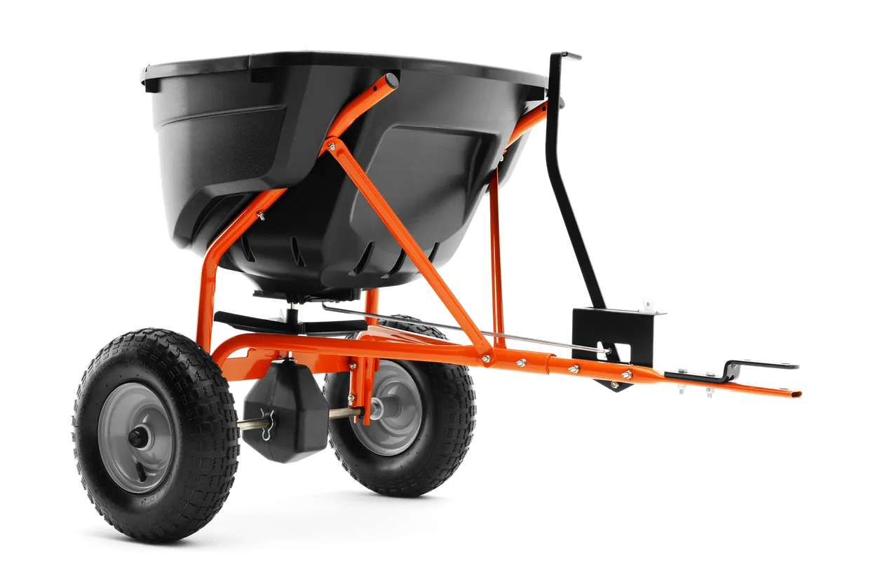 Handy spreader with easily adjustable flow, for larger areas. Enclosed commercial-grade gearbox for smooth rolling and easy maintenance. Large pneumatic tyres for easy manoeuvrability. Durable nylon cover included. Can be used for spreading fertiliser and seeds in your garden, as well as ice melt during winter season. If used with salt, make sure to clean spreader hopper and tubes after use, to prevent corrosion.