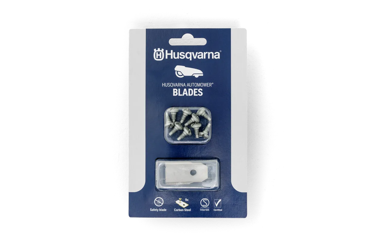 Husqvarna Automower® Blades – hardened carbon steel blades, designed for safe handling and pivoting functionality. Safety blade according to standards.