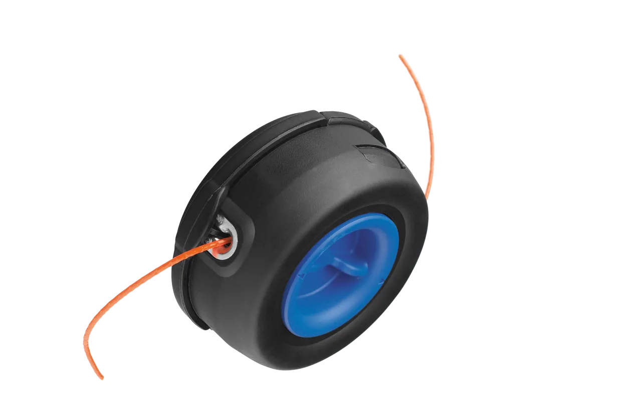 Trimmer head with manual cord feed. The cord is fed manually by the user when pushing the cord feed button and pulling the cord. All manual feed heads include provision for external loading of line.