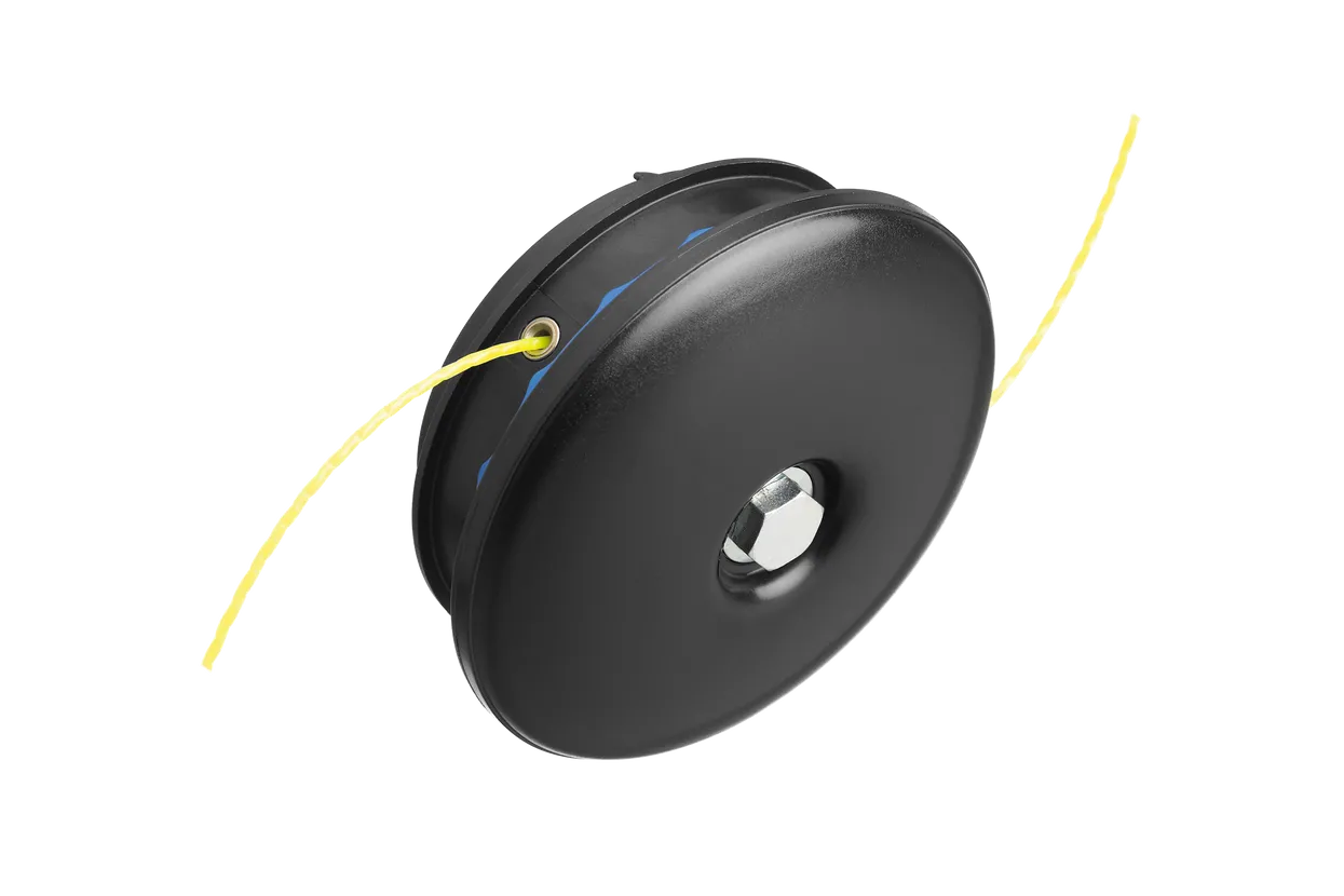 Trimmer head with manual cord feed. The cord is fed manually by the user when pushing the cord feed button and pulling the cord. SII trimmer head is extremely robust for commercial use. Freewheeling skid plate with ball bearing. All manual feed heads include provision for external loading of line.