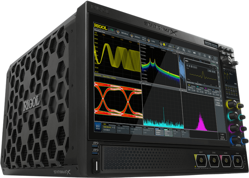 The innovative UltraVision III platform combines updated oscilloscope and spectrum analysis technology with its custom front-end Phoenix ASIC chipset to expand RIGOL solutions into new applications. In addition to 3 or 5 GHz bandwidths, StationMax provides 4 channels, 20 GSamples/sec sample rate (10 GSa/sec on all channels), 1 million waveforms/sec capture rate, 2 Gpts maximum storage depth, and high resolution measurements up to 16 bits.