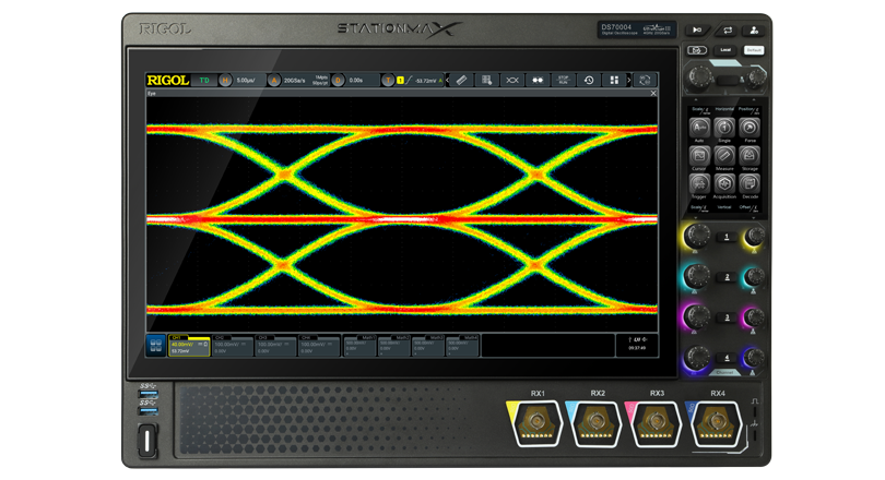 The DS70000 series digital oscilloscope adopts RIGOL's chipset "Phoenix", delivering excellent performance with a maximum sample rate of 20 GSa/s, up to 5 GHz bandwidth. RIGOL's brand new UltraVison III technical platform guarantees the specifications to reach the advanced level in the industry, with the capture rate up to millions of waveforms per second, 2 Gpts memory depth, 8-16 bits adjustable resolution, and 10,000 FFTs/s.