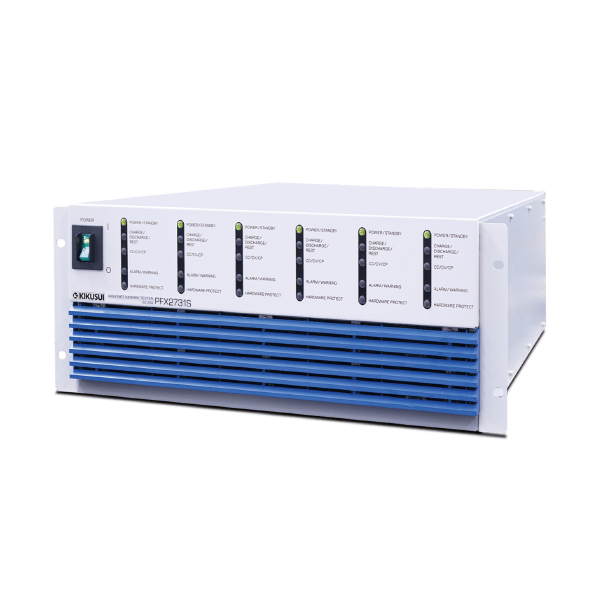 The PFX-2731S is a 6 V-20 A 6-channel battery tester that supports high-rate charge/discharge tests. It is operated with the application software BPChecker4000, which is exclusive to the PFX-2731S. As one PC can operate up to 4 units (24 channels), one can construct a multi-channel charge/discharge system according to the required number of channels. In order to safely conduct long-term continuous testing, it also has 2-system independent protection functions for hardware and software, as well as various protection functions such as a connection confirmation function that detects incorrect wiring and integrated capacity protection.