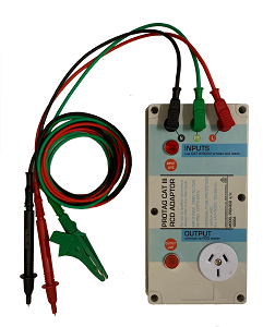 Single phase or three-phase connections to a switchboard is established using CAT III 600V leads and probes. Output is a standard Australian 240V socket for connection to a third party RCD TESTER.