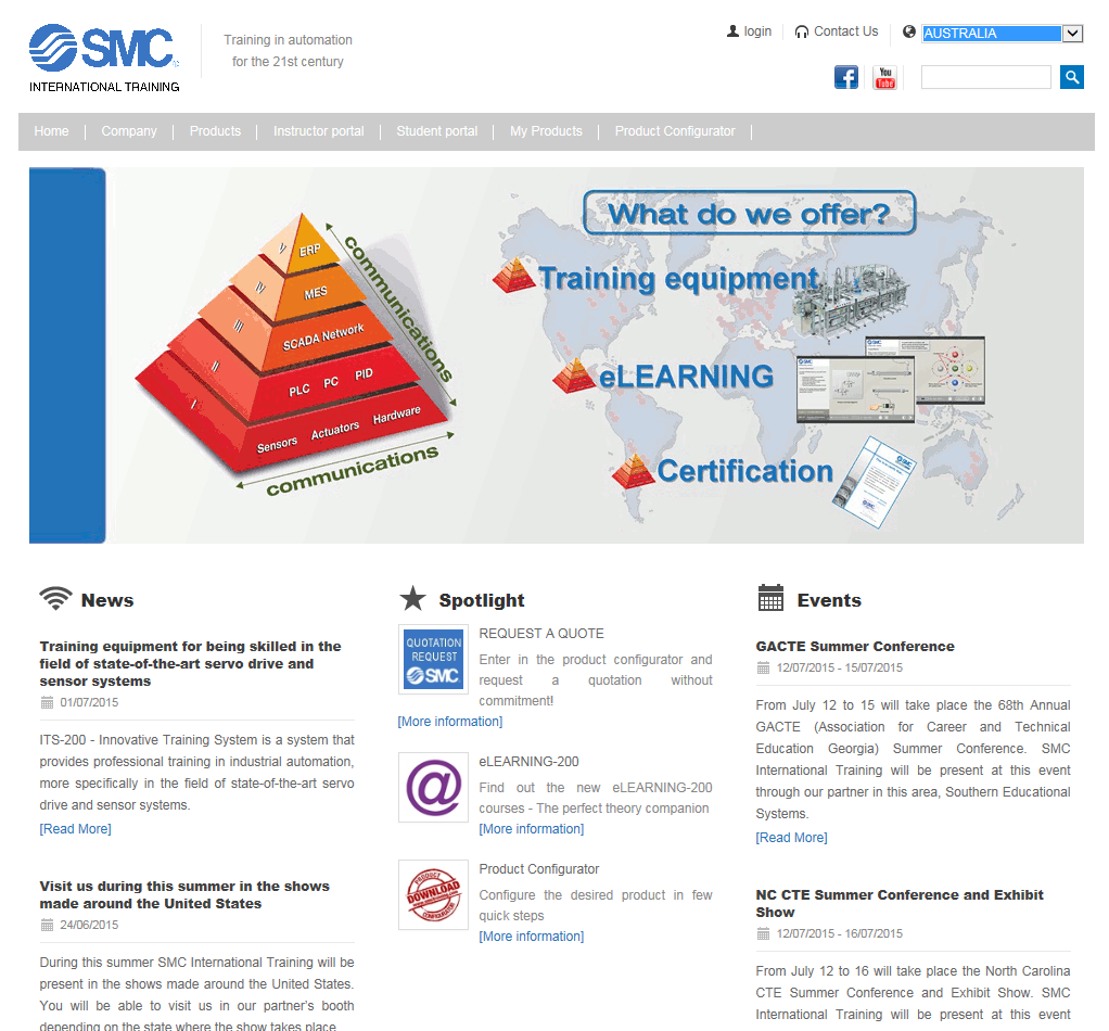 Vast experience in the fields of industry and education has led us to develop a wide range of products and services to meet the need for skills training in mechatronics / industrial automation. SMC International Training offers: Didactic equipment, eLEARNING courses and Certification.