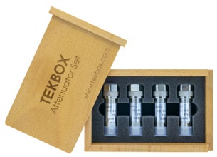 The TBAS4 RF attenuator set consists of 3dB, 6dB, 10dB and 20dB, 6 GHz/2W N-attenuators in a beech wood box.