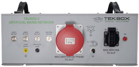The TBL5032-3 is a Line Impedance Stabilization Network for the measurement of line-conducted interference within the range of 9 kHz to 30MHz, according to the CISPR 16-1-2 standard. The device is designed for testing 3-phase and single phase, AC-powered equipment with supply voltages up to maximum 450V/260V and 32A. Conducted noise can be measured on each phase and on the neutral conductor. The TBL5032-3 has separate RF outputs for each phase and neutral and consequently can be coupled with the TBLM1 to split the emissions in its common mode and differential mode components. The TBL5032-3 has no integrated high pass filter at the RF outputs, but comes with an external 9 kHz coaxial high pass instead.