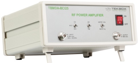 The TBMDA-BCI25 modulated amplifier provides the necessary bandwidth and modulation for conducted immunity testing using BCI probes per ISO 11452-4 in the frequency range from 1 MHz to 400 MHz. It is designed to be driven by signal generators or by tracking generators of spectrum analyzers. With a 1 dB compression point of up to 30 W in the frequency range 1 MHz to 400 MHz it can generate test levels up to 400mA. A built in AM / PM – modulator enables use of tracking generators as signal source. The TBMDA-BCI25 has sufficient gain to achieve maximum output power with 0 dBm provided by a spectrum analyzer tracking generator.