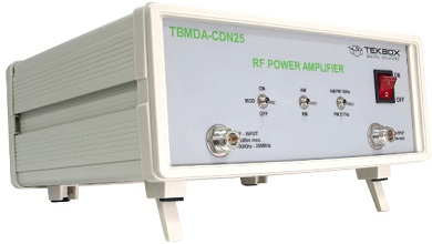 The TBMDA-CDN25 modulated amplifier provides the necessary power, bandwidth and modulation for conducted immunity testing using CDNs and BCI probes in the frequency range from 100 kHz to 250 MHz. It is designed to be driven by signal generators or by tracking generators of spectrum analyzers. With a 1 dB compression point of up to 25 W in the frequency range 100 kHz to 250 MHz it can generate test levels class 1, class 2, class 3 and class X according to ISO / EN 61000-4-6. A built in AM / PM – modulator enables use of tracking generators as signal source. The TBMDA-CDN25 has sufficient gain to achieve maximum output power with 0 dBm provided by a spectrum analyzer tracking generator.
