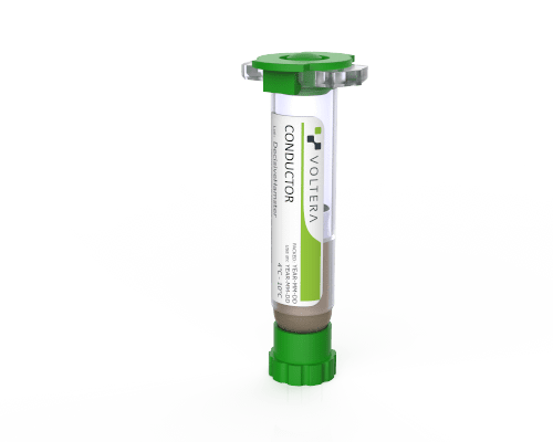 The key to printing a circuit board with the V-One is in the ink. The printer lays down silver ink as the traces and pads that comprise your board. After thermal curing, the ink is conductive and ready for reflow.