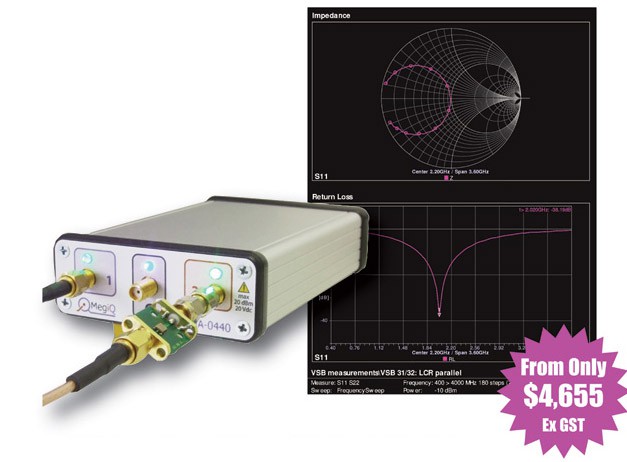 With the VNA0440, MegiQ has launched an affordable and compact USB driven Vector Network Analyzer. This fully bi-directional two-port VNA allows detailed impedance measurements of antennas, components and circuits, covering 400to 4000MHz, i.e. all popular communication bands for GSM-LTE, GPS, ISM, Wifi, Dect etc.